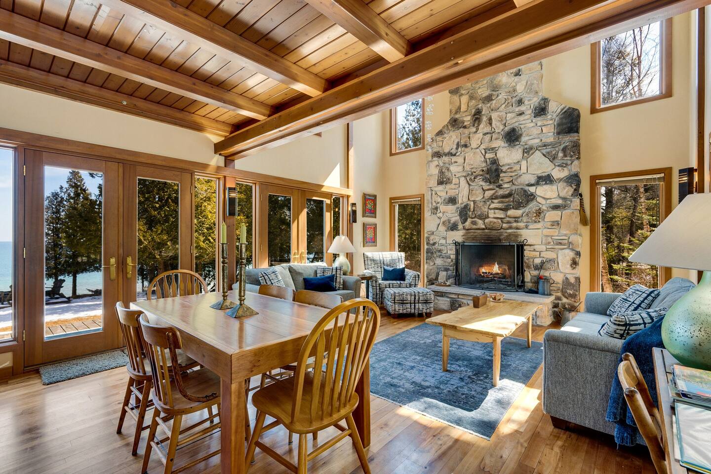 4 Bedrooms • 4 Bathrooms (3 full, 1 half) 4 Baths (3 full, 1 half) • Sleeps 2-8Enjoy this luxury home on the scenic shores of Lake Michigan where the sound of waves relaxes you day & night. At the Park’s edge this private, custom-designed, dog friendly home features high-end details, cathedral ceiling fireplace, 2 decks, windows galore and a bathroom for each bedroom!